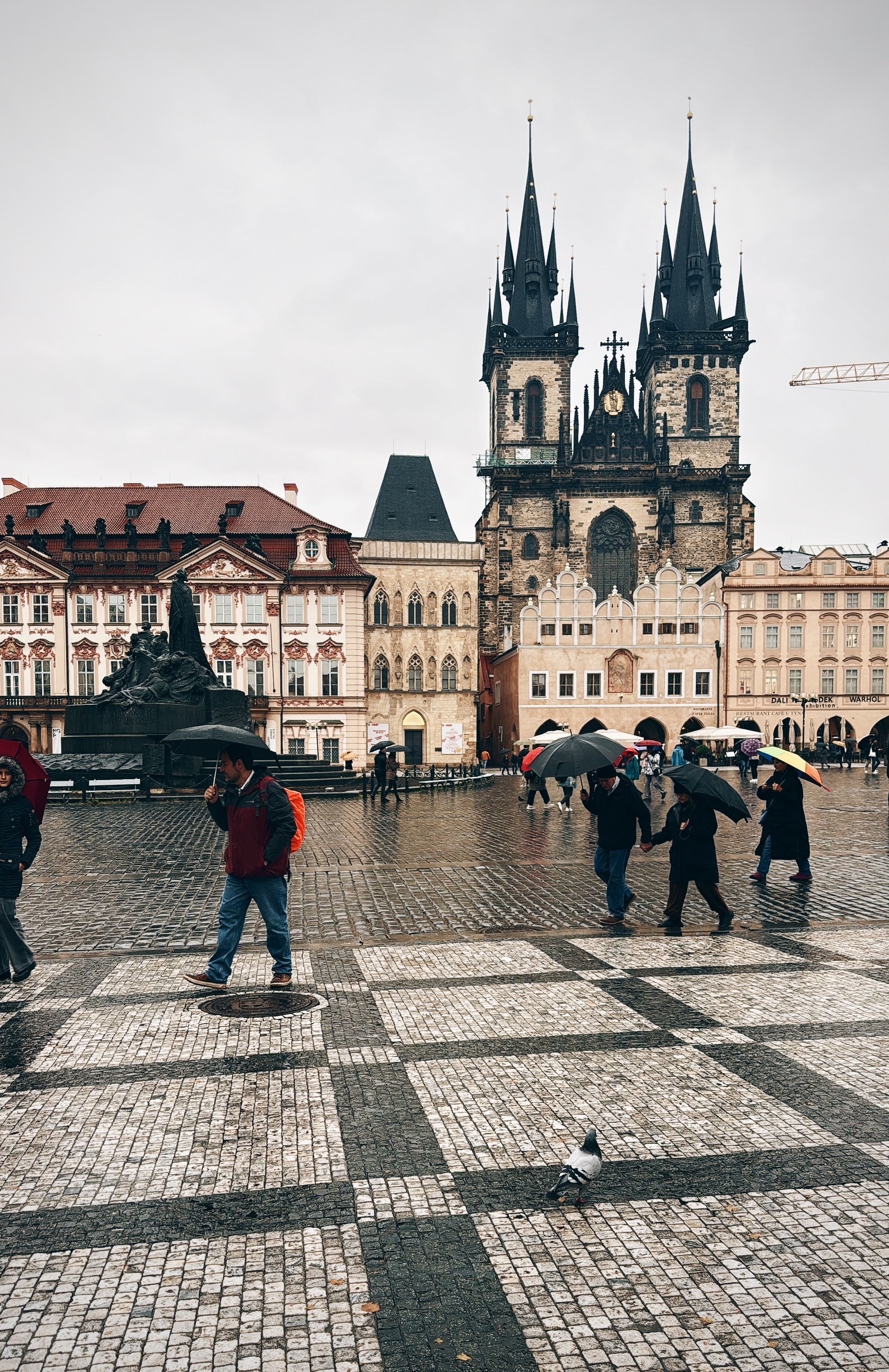 라떼 마신 후, 구시가지 광장을 가로질러 바츨라프 광장-숙소로 갔다. 틴 성당 첨탑도, 얀 후스도 비는 싫을 거 같다...