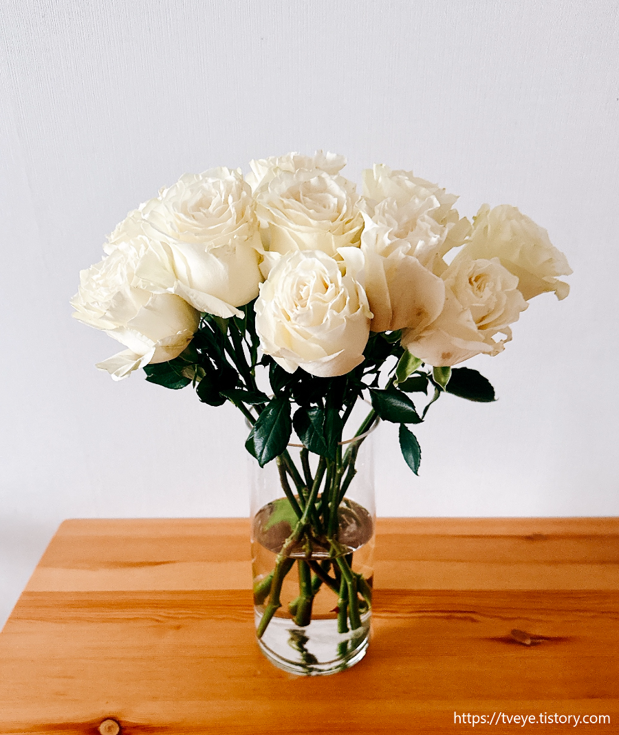 꽃이 은근히 크고 무거웠고 차도 끊겨서 간밤 엄청 늦게 택시 타고 돌아와 한동안 쓰지 않았던 기다랗고 큰 화병을 꺼내 꽂아두었음.