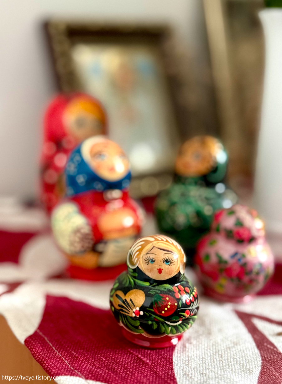지금 집으로 이사온지 근 5년이 되었는데, 예전 집은 더 작았지만 벽에 선반이 있어서 마트료슈카들을 줄줄이 늘어놓을 수도 있었으나 이사온 후에는 귀찮아서 그냥 제일 큰 애들만 이렇게 놔두었다. 이 녀석들 안에 5마리, 10마리 등등 들어 있는데. 엄마는 우리집에 오면 '제발 그릇장에 처박아놓은 그 많은 찻잔들 이쁘게 차려놓을 진열장도 사고 소파도 바꿔라' 라고 하는데 나는 정말 게으르고 살림도 꾸미는 것도 관심이 없나보다 ㅜㅜ 사실 예쁘게 해놓으면 좋긴 한데 그리 크지 않은 집에 가구를 자꾸 들이고 싶지가 않아서 그런 것 같음. 이 마트료슈카도 아주 조그맣지만 사실 10개짜리인데... 나는 카페 자이칙을 차리면 이 모든 것들을 해결할 수 있을텐데. 마트료슈카부터 조그만 인형들부터 예쁜 엽서들에 온갖 찻잔들에... 그러나 카페라는 건 모름지기 건물주 아들이나 딸이 아니고서는 차릴 수 없는...