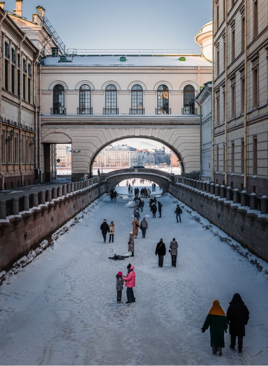 요즘 페테르부르크 풍경을 담은 sns들은 얼어붙은 운하와 네바 강 위를 걸어다니는 사람들 사진과 영상들로 가득 차 있다. 이건 에르미타주 건물과 건물 사이에 있는 짐냐야 까나브까, 우리 말로는 겨울 운하. 에르미타주가 겨울 궁전이니까. 이 운하는 여름에도 겨울에도 아름답다. 사진은 andrei mikhailov