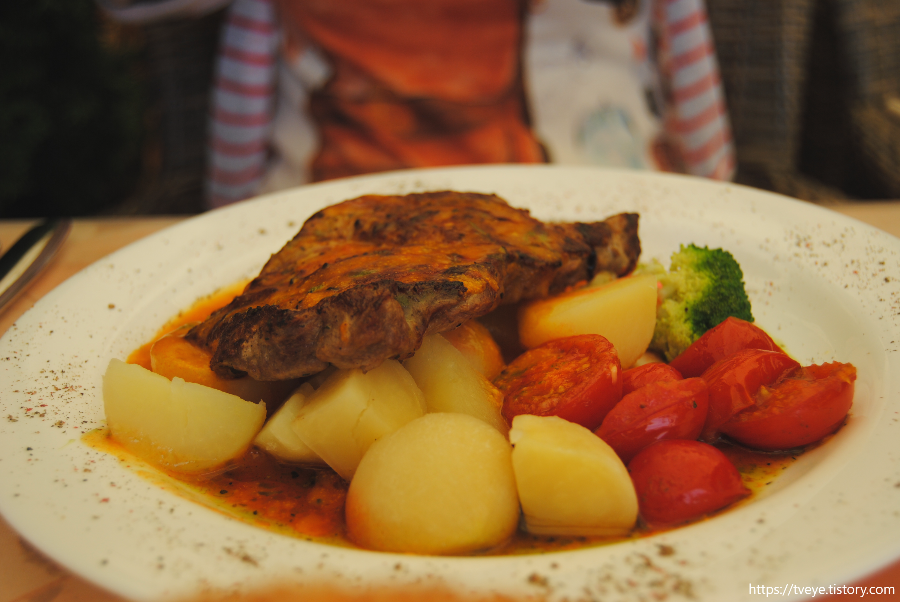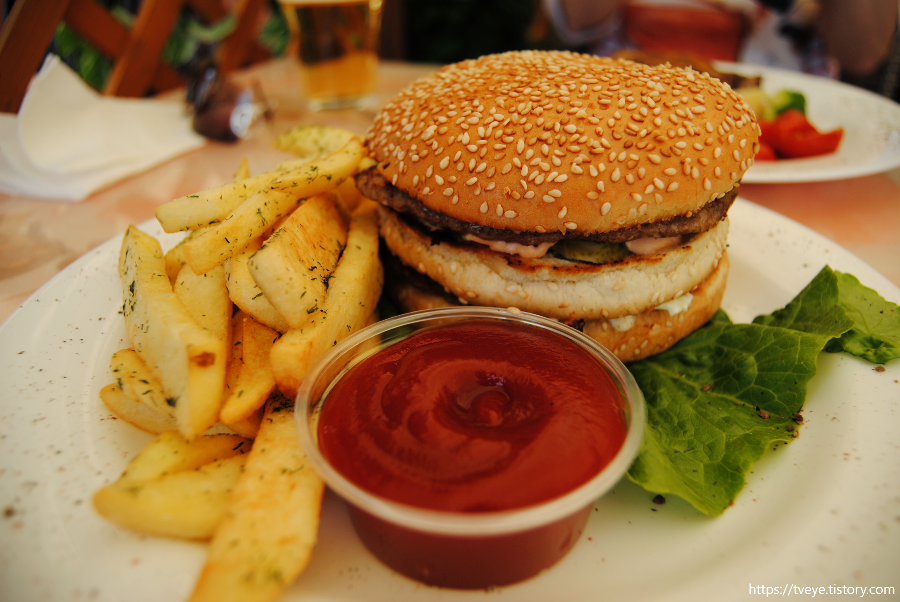 음식도 맛있었음. 우리는 치즈버거 세트와 무슨 돼지고기 스테이크 같은 걸 시켜서 먹었던 것 같다. 여기에 생선수프도 한 그릇 있었는데 그걸 내가 옷에 엎었음 흐흑... 원래 음식 잘 안 흘리는데.